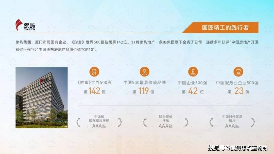 象屿地产国匠精工的践行者象屿集团,厦门市属国有企业,《财富》世界500强位居第142位。31载象屿地产,象屿集团旗下全资子公司,深耕长三角核心都市圈,享誉华东区域的精品住宅开发商,连续多年获评“中国房地产开发稳健十强”和“中国华东房地产品牌价值TOP10”。象屿地产位列2024年上半年全国销售金额第30位(操盘)、上海市场销售金额位列第17位(操盘)、苏州市场销售金额位列第一。