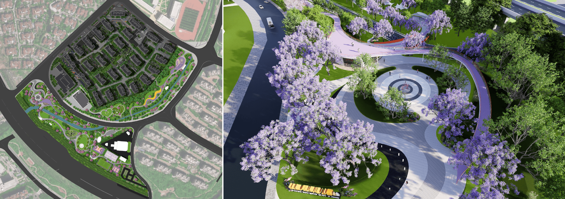 景观结构:通过微地形+雨水花园+交叠步道,形成“乔木-灌木-地被”三层植被体系,种植粉花山扁豆、日本晚樱等,营造“步步见绿、处处有景”的林下空间。