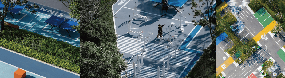 运动体系:600米健康跑道+健身器械区+社区体育场地,地面采用悦动铺装,周边种植大腹木棉、现代月季,运动同时享受花香与绿意。