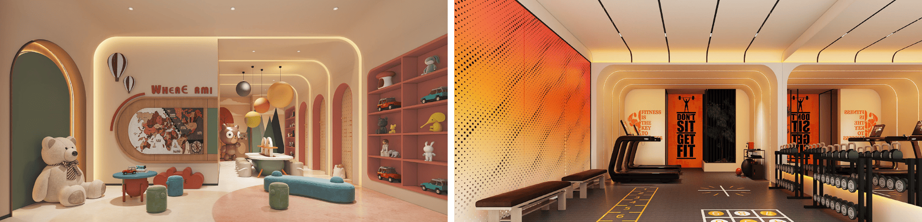架空层泛会所:充分利用小区架空层空间,打造业主泛会所区域,内部规划儿童娱乐区、健身房、多功能学习活动等多个功能区。