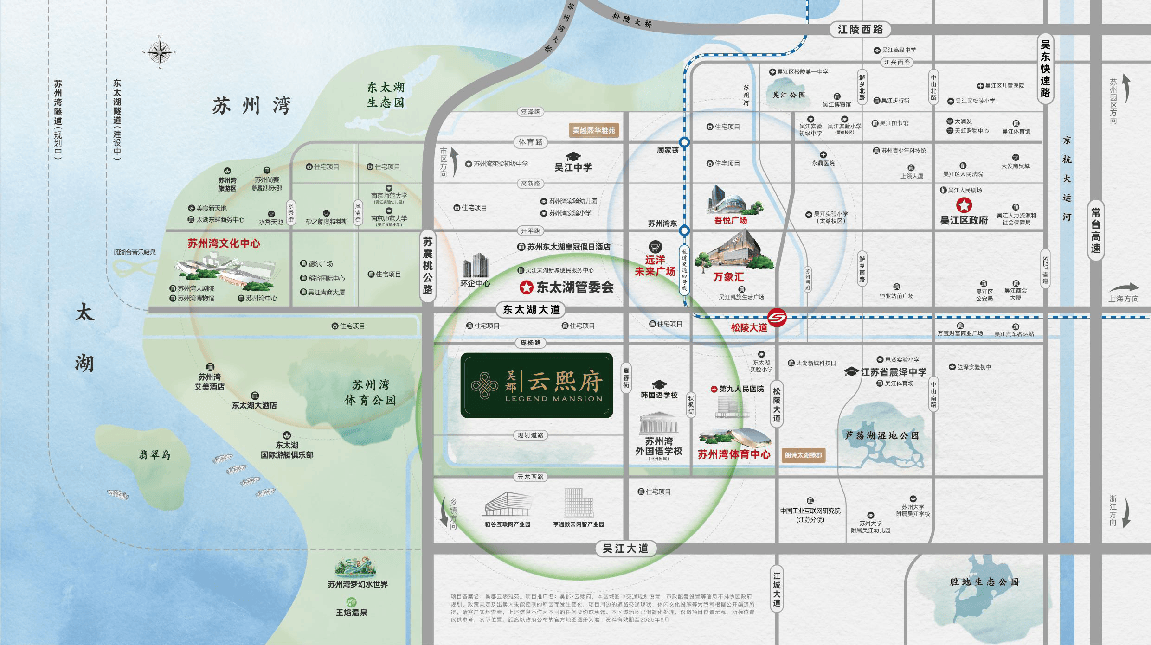 住在黄金三公里生活圈选择这里,就是选择了一种顶级的生活方式。出门就是东太湖生态园和体育公园,拥有约20公里的纯净湖岸线,散步骑行随心所欲。 日常所需更是近在咫尺:万象汇、吾悦广场等大型商业体满足购物需求;苏州湾文化中心、大剧院、体育中心是您陶冶情操、锻炼身体的好去处。 孩子上学有苏州湾外国语学校等一众名校环绕;家人健康有苏州市第九人民医院(约1公里)保驾护航,非常安心。 出行也四通八达,地铁4号线、东太湖大道等主干道环绕,未来还有东太湖隧道和苏州湾隧道,去哪都方便。这构成了无可比拟的苏州湾生活圈。